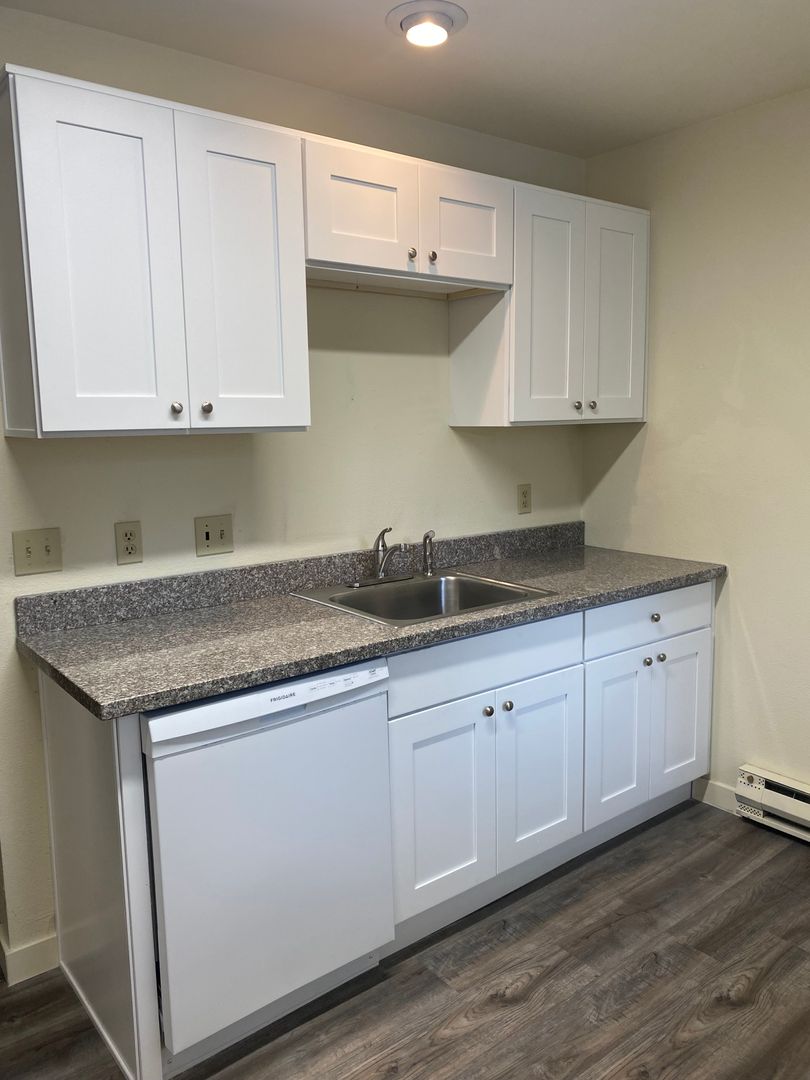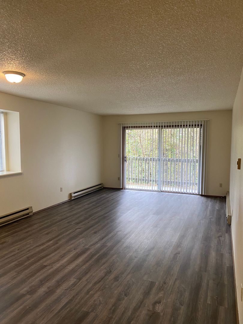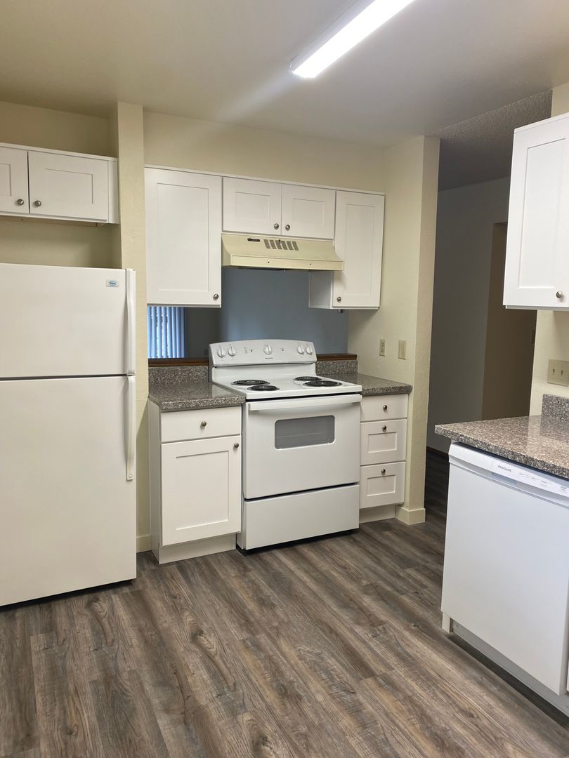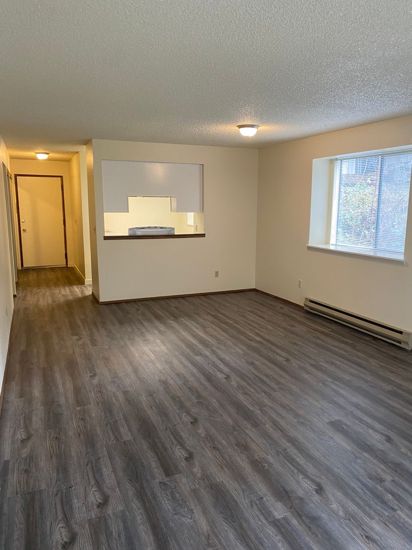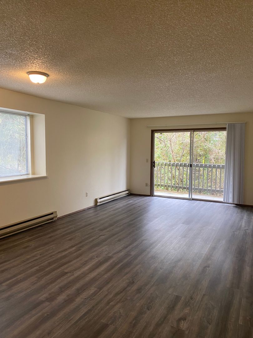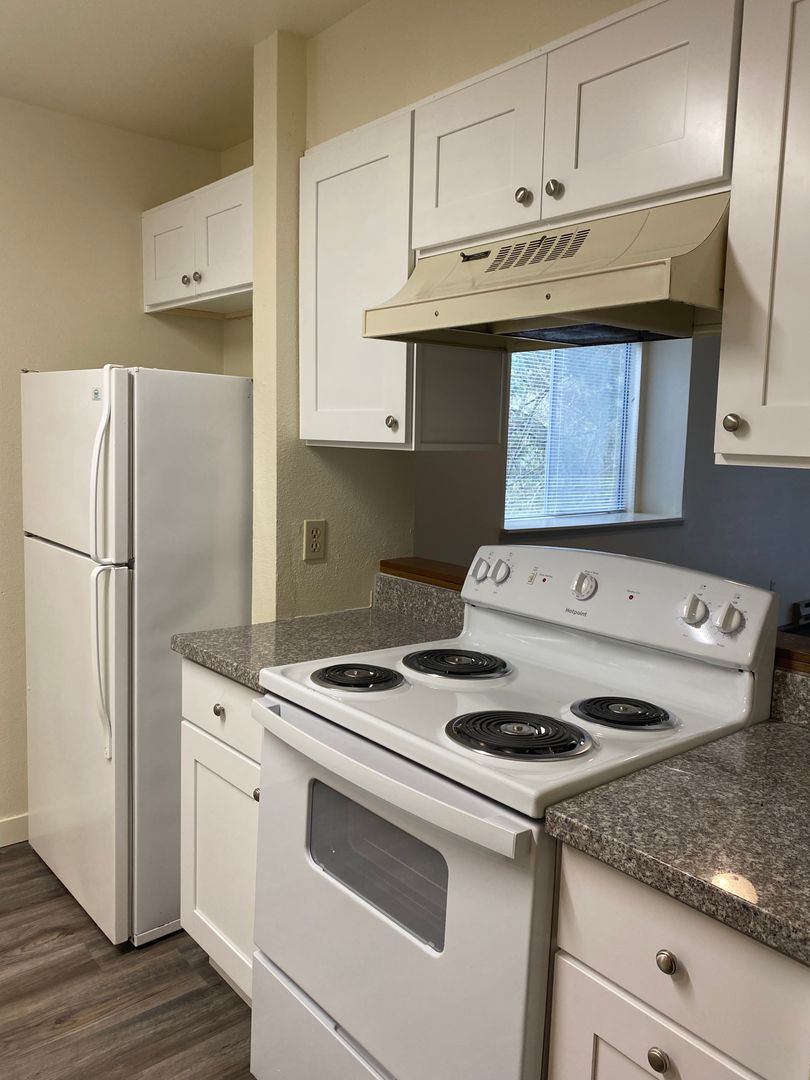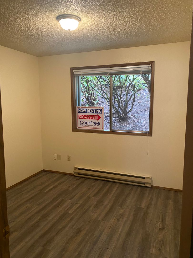 Recently updated two bedroom one bath unit. 990 sq. ft. This unit has a balcony overlooking Fanno Creek. All new Vinyl plank flooring, shaker style kitchen cabinets. Fresh paint, and a very spacious Living Room. Washer/Dryer Hookups in hallway. Downtown Portland with easy access Tri-Met bus line 54. Shop, restaurants and grocery just a few minutes away. Quick access to I-5. Tenant pays electric and internet. Water/Sewer/Trash included.