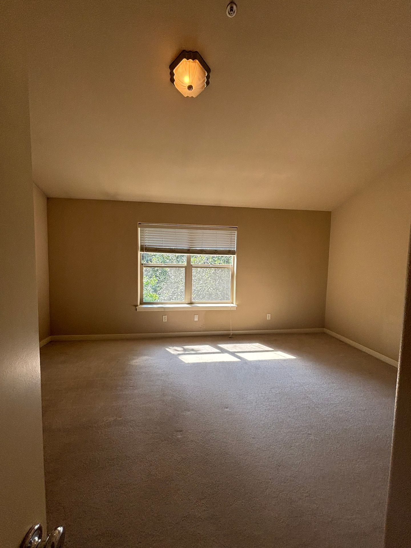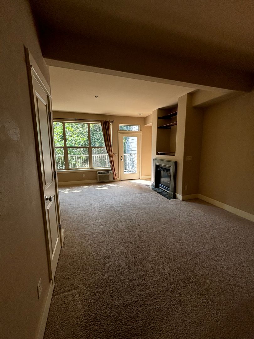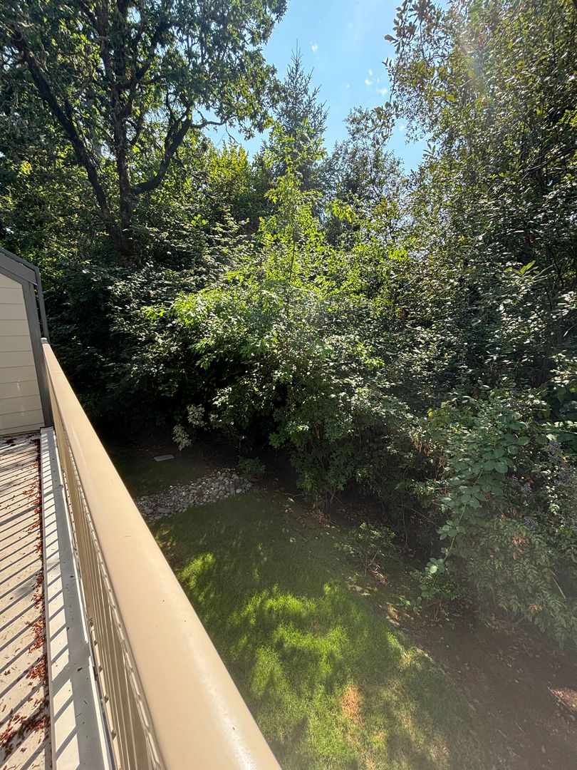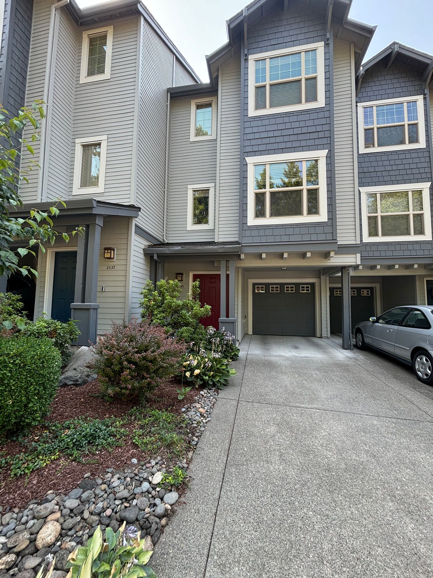 Beautiful three story condominium with a peaceful and private view of the trees out the back windows. 2 bedrooms and 2 1/2 bathrooms with 1453 sq. ft. Gorgeous kitchen with hardwood floors, granite counter tops, and cherry stained cabinets. Stainless steel kitchen appliances (gas) and also includes a washer/dryer set. Large living room with cozy gas fireplace! Formal dining area in living room or use informal dining area and breakfast bar in kitchen. Private balcony deck off the living room looks out to trees. Oversized 2 car tandem parking garage with extra storage area. Additional parking for one car under carport. Walking areas close by as well as park and library. No smoking, no pets.