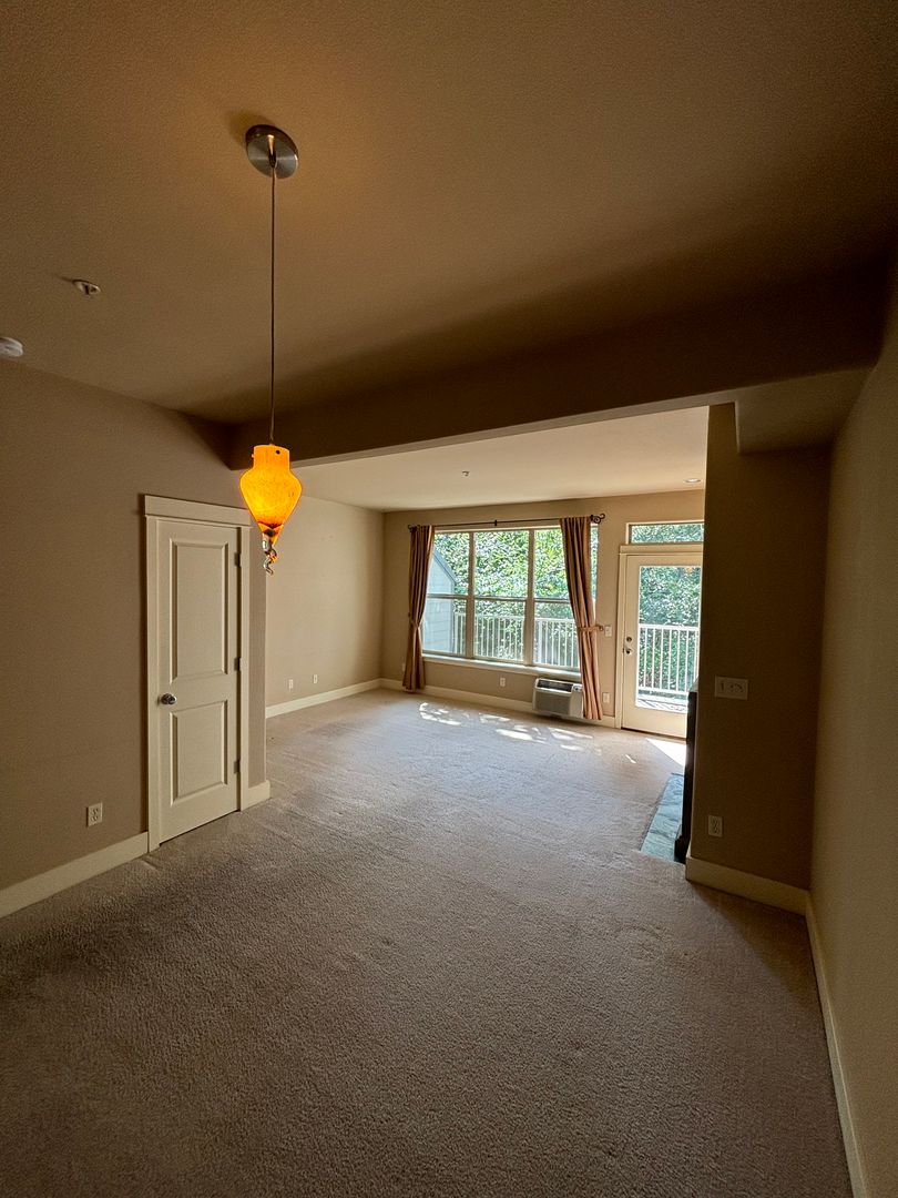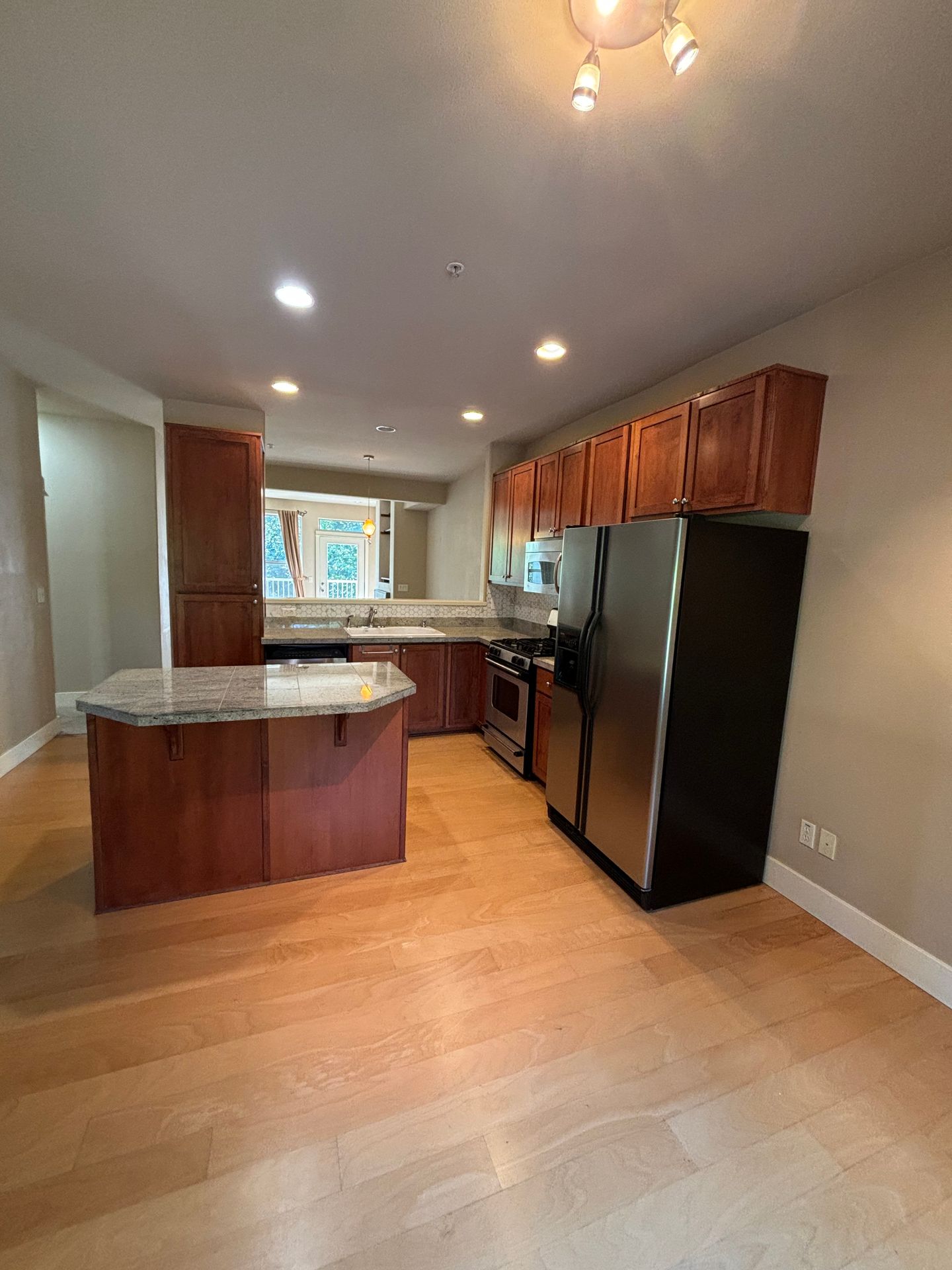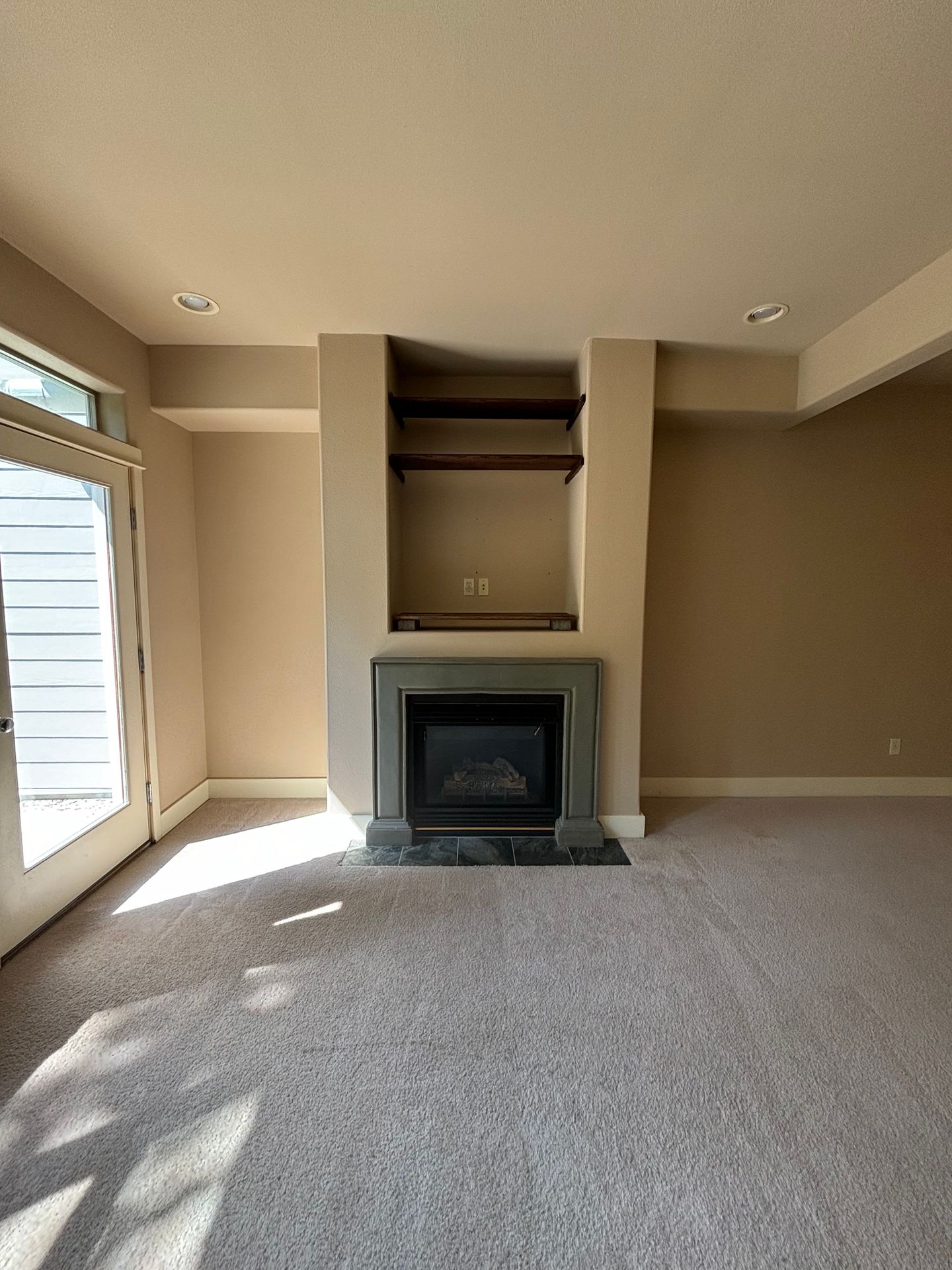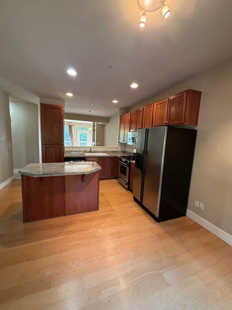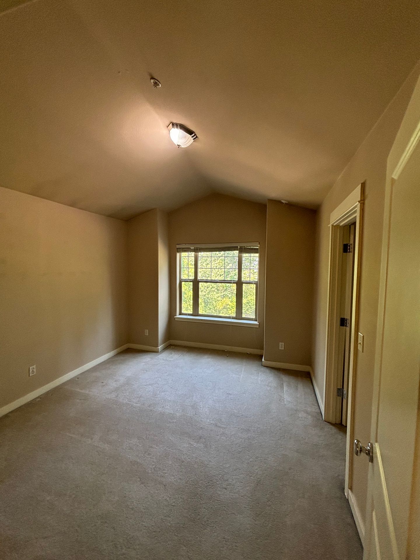 Beautiful three story condominium with a peaceful and private view of the trees out the back windows. 2 bedrooms and 2 1/2 bathrooms with 1453 sq. ft. Gorgeous kitchen with hardwood floors, granite counter tops, and cherry stained cabinets. Stainless steel kitchen appliances (gas) and also includes a washer/dryer set. Large living room with cozy gas fireplace! Formal dining area in living room or use informal dining area and breakfast bar in kitchen. Private balcony deck off the living room looks out to trees. Oversized 2 car tandem parking garage with extra storage area. Additional parking for one car under carport. Walking areas close by as well as park and library. No smoking, no pets.